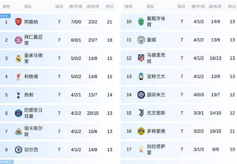 只看积分数据,不难发现,所有英超参赛队伍均占据前八席位,彰显出联赛整体实力。另外,除英超外,积分达到13分的仅有“皇马—皇家马德里—阿森纳”三强、卫冕冠军巴黎圣日耳曼以及葡萄牙体育、马德里竞技和亚特兰大等队伍,表明各大赛事集团围堵英超的态势已渐成形,但影响有限。